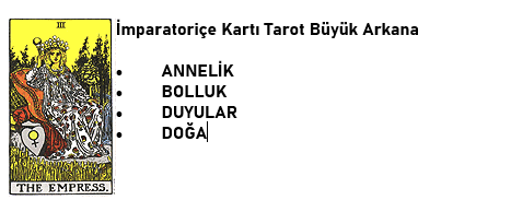 İmparatoriçe, doğanın cömertliği ve Dünyanın ritimleri üzerinde hüküm süren bereketli, hayat veren Anneyi temsil eder. Duyuların tüm zevkleri ve sevinçleri ve tüm formlarında yeni yaşamın bolluğu ondan gelir. İmparatoriçe, varlığımızın temeli olan doğal dünya ile bağlantılarınızı güçlendirmeniz için sizi teşvik ediyor. Çoğu zaman sahte bilgi ve zevkler bizi köklerimizden uzaklaştırır. İmparatoriçenin size ayaklarınızı yere sağlam basmanız gerektiğini hatırlatmasına izin verin.