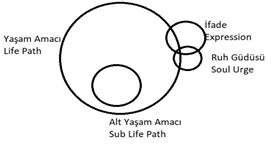 Büyük daire yaşam amacı / yaşam yolu / life path dairesi. Bu dairenin içinde çizdiğimiz daire alt yaşam amacı. Büyük dairenin sağ üst kısmına çizdiğimiz ve büyük daireyle kesişen daire ifade sayısı.