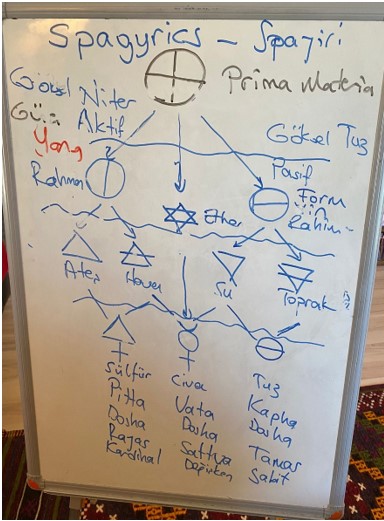 Yağını damıtarak; alkolünü fermente ederek; tuzunu da yakarak saflaştırıyorsunuz. Ondan sonra bu üçünü birleştiriyorsunuz. Bu da Spajiri. Yine yöntem aynı; benzer benzeri tedavi eder.